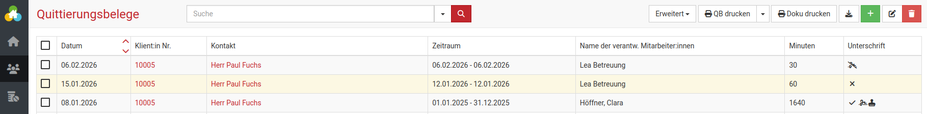 Via Betreuung->Quittierungsbelege können Sie sich die Quittierungsbelege anzeigen lassen.