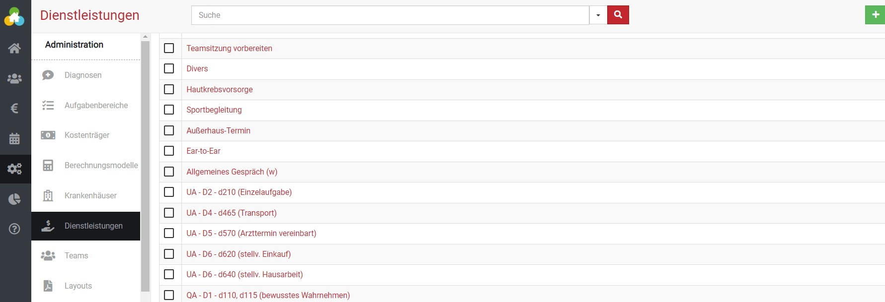 Unter dem Menüpunkt Administration finden Sie eine Übersicht aller Dienstleistungsarten, die Sie für Termine auswählen können, somedo stellt Ihnen hier eine Auswahl an typischen Dienstleistungen wie Telefonat, Ausflug, Ärzt:innenbesuch oder Wohnungsbesichtigung zur Verfügung.