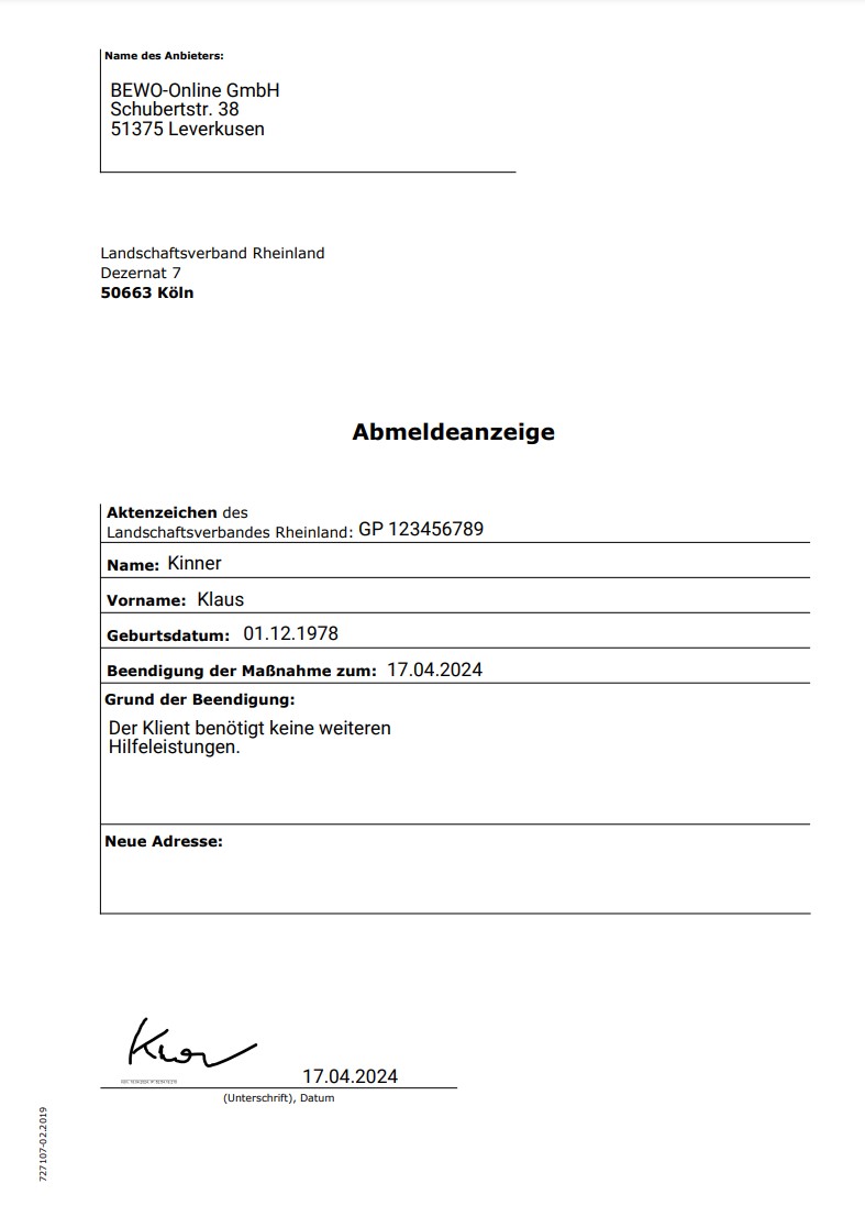 Abmeldeanzeige LVR BeWo Beispiel – Digital erstellt in somedo inkl. Unterschrift