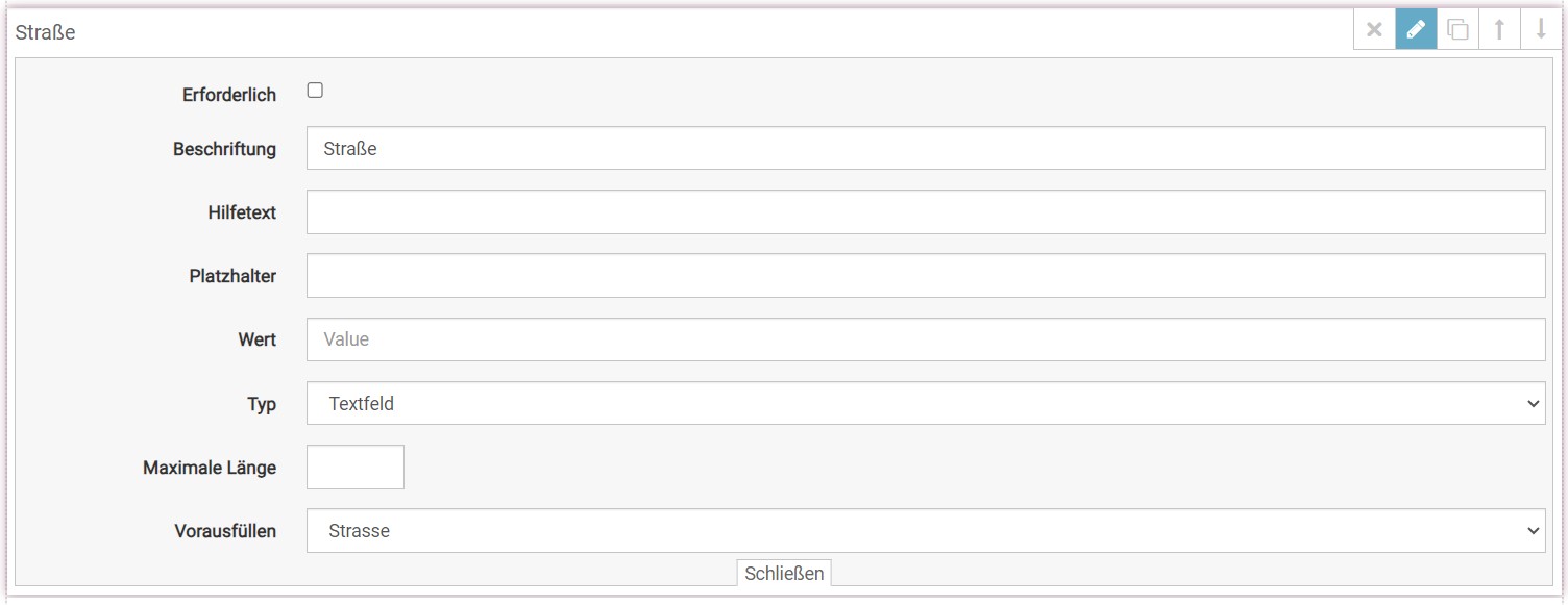 Wichtig: Jedes Element kann mit dem Stiftsymbol bearbeitet werden. So kann z.B. bei einem Namen/Straße Textfeld unten im Bereich „Vorausfüllen“ auch angegeben werden, dass die jeweilige Variable aus den Stammdaten automatisch bei der Erstellung eines Formulars in der Akte generiert wird. So sparen Sie sich weitere Zeit und müssen keine Stammdaten neu eintragen.