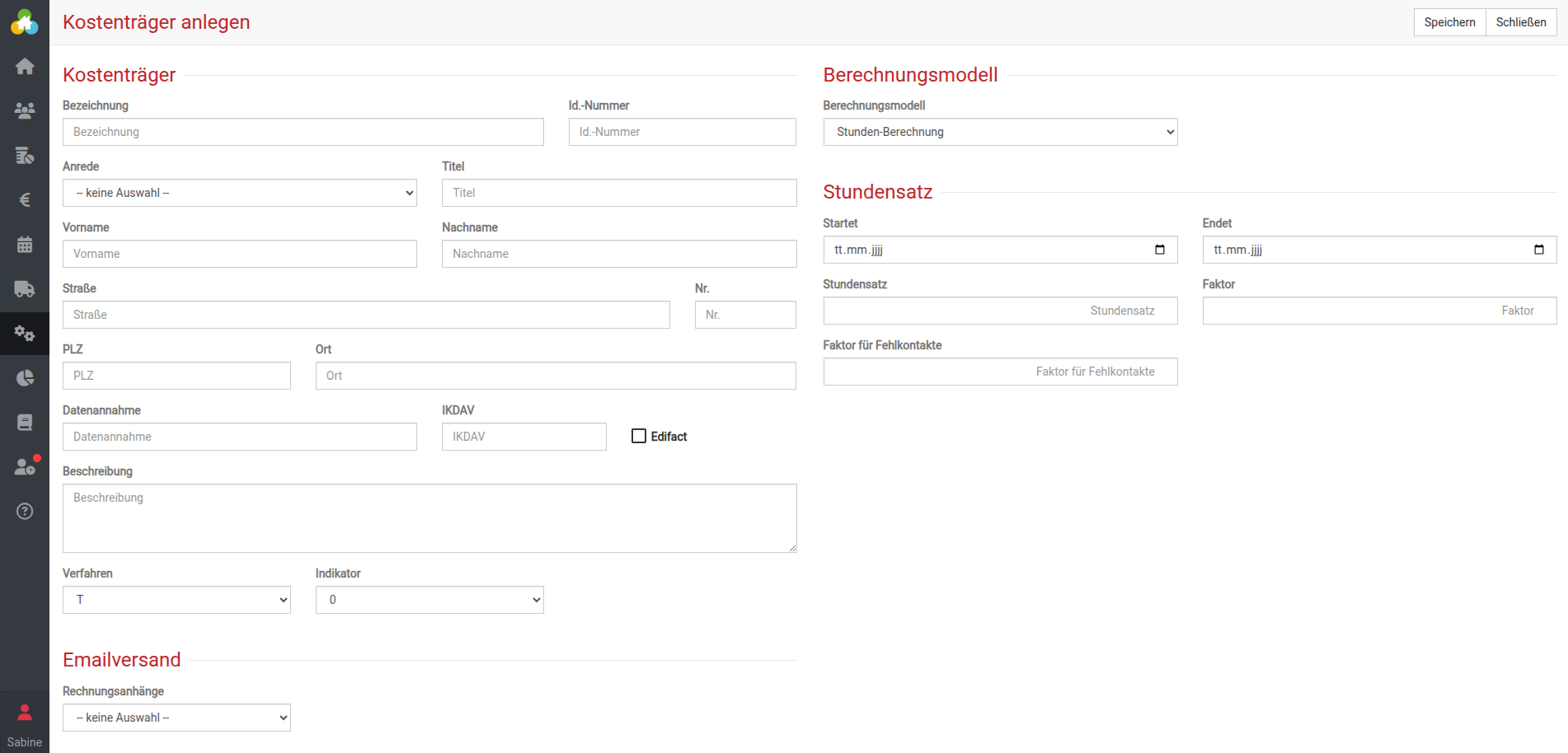 Über den Menüpunkt Administration gelangen Sie zu der Rubrik Kostenträger. Hier finden Sie die verschiedenen Kostenträger bzw. die Behörden, mit denen Sie zusammenarbeiten und über die Sie abrechnen. Dabei ist auch die Höhe des Stundensatzes festgehalten, den Sie von dem jeweiligen Kostenträger erhalten. Da die Kostenträger von der jeweiligen Region und dem jeweiligen Bundesland abhängig sind, legen Sie diese hier selber an.