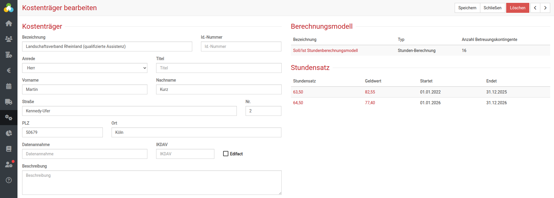 Im Abschnitt „Stundensatz“ legen Sie direkt den aktuellen Stundensatz inkl. Gültigkeit, Faktor und Faktor für Fehlkontakte zum Kostenträger mit man.