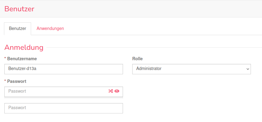 Ändern Sie nun den Benutzernamen und legen das Passwort und die Rolle des Benutzer:in Account fest und speichern anschließend Ihre Eingaben. Der:Die Benutzer:in kann nach der Anmeldung das Passwort selbstständig ändern.