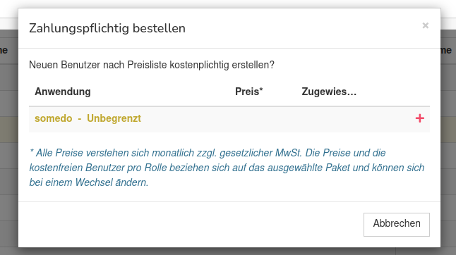 Hinweis: Nach Klick auf das + im Fenster „Zahlungspflichtig bestellen“ wird der:die Benutzer:in automatisch angelegt. Dabei wird automatisch ein Benutzer:in Name vergeben. Diesen können Sie anschließend beliebig ändern.