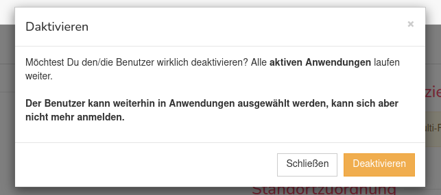 Klicken Sie in der Benutzer:innen Verwaltung auf den:die gewünschte Benutzer:in. Ist der:die Benutzer:in aktiv, können Sie oben rechts im Menü auf Deaktivieren klicken.
