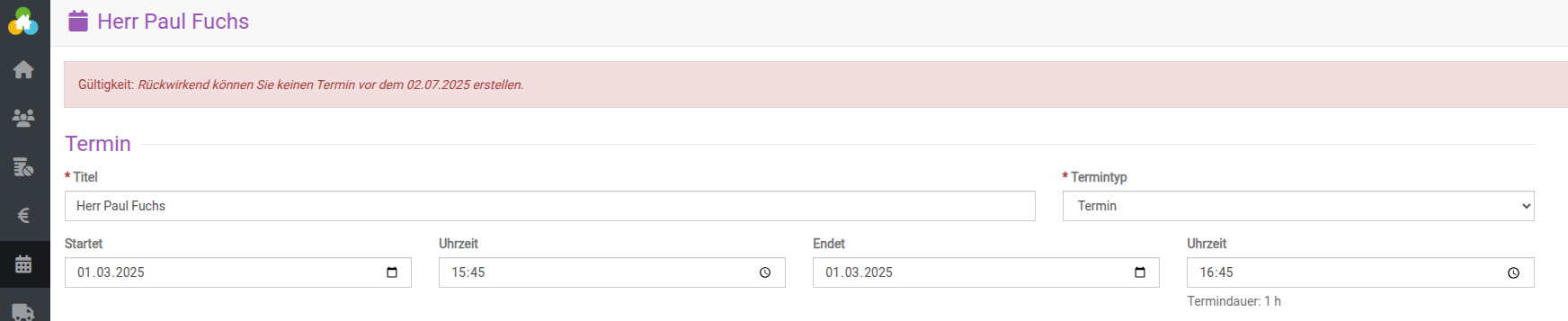 Ist dort eine Begrenzung festgelegt, kann anschließend kein Termin nach ausgewählten Kriterium erstellt werden. Beim Versuch, einen Termin vor diesem Zeitraum anzulegen, erhalten Sie anschließend folgende Meldung: