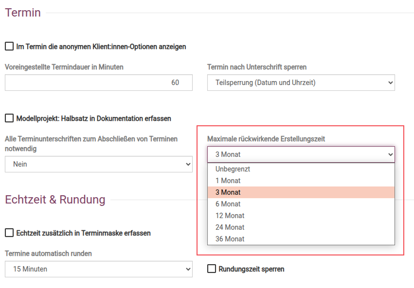 Terminsperre – maximale rückwirkende Erstellungszeit