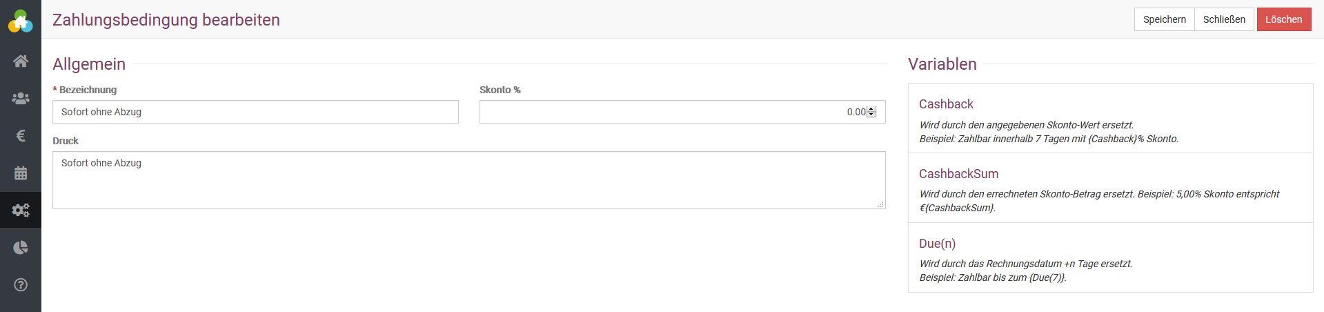 Für die Bearbeitung bzw. Individualisierung von Zahlungsbedingungen werden Ihnen Variablen angeboten, ähnlich wie bei der Erstellung von Textbausteinen und Layouts.