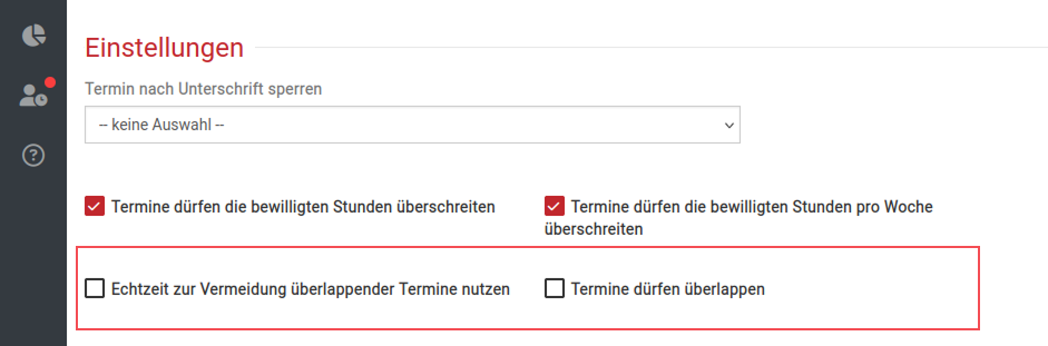 Sie können im Abschnitt Einstellungen im jeweiligen Betreuungskontingent auch festlegen, ob die zugehörigen Termine überlappen dürfen oder nicht. Ist die Checkbox „Echtzeit zur Vermeidung überlappender Termine nutzen“ nicht aktiv, wird die Rundungszeit als Valdierung genutzt.