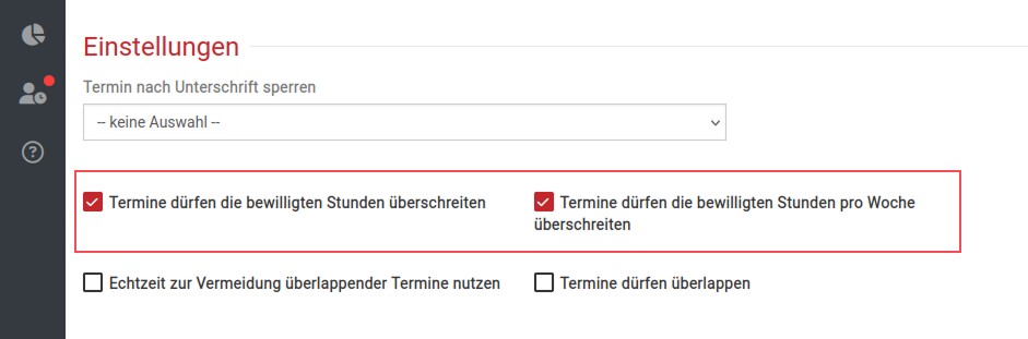 In somedo können Sie für jedes Betreuungskontingent festlegen, ob die bewilligten Stunden allg. oder pro Woche überschritten werden können. Dazu gibt es in dem jeweiligen Betreuungskontingenten im Abschnitt Einstellungen zwei Checkboxen.