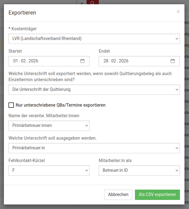 - auswählen, ob die Unterschrift der Quittierung oder die Unterschrift des Einzeltermins exportiert werden soll
