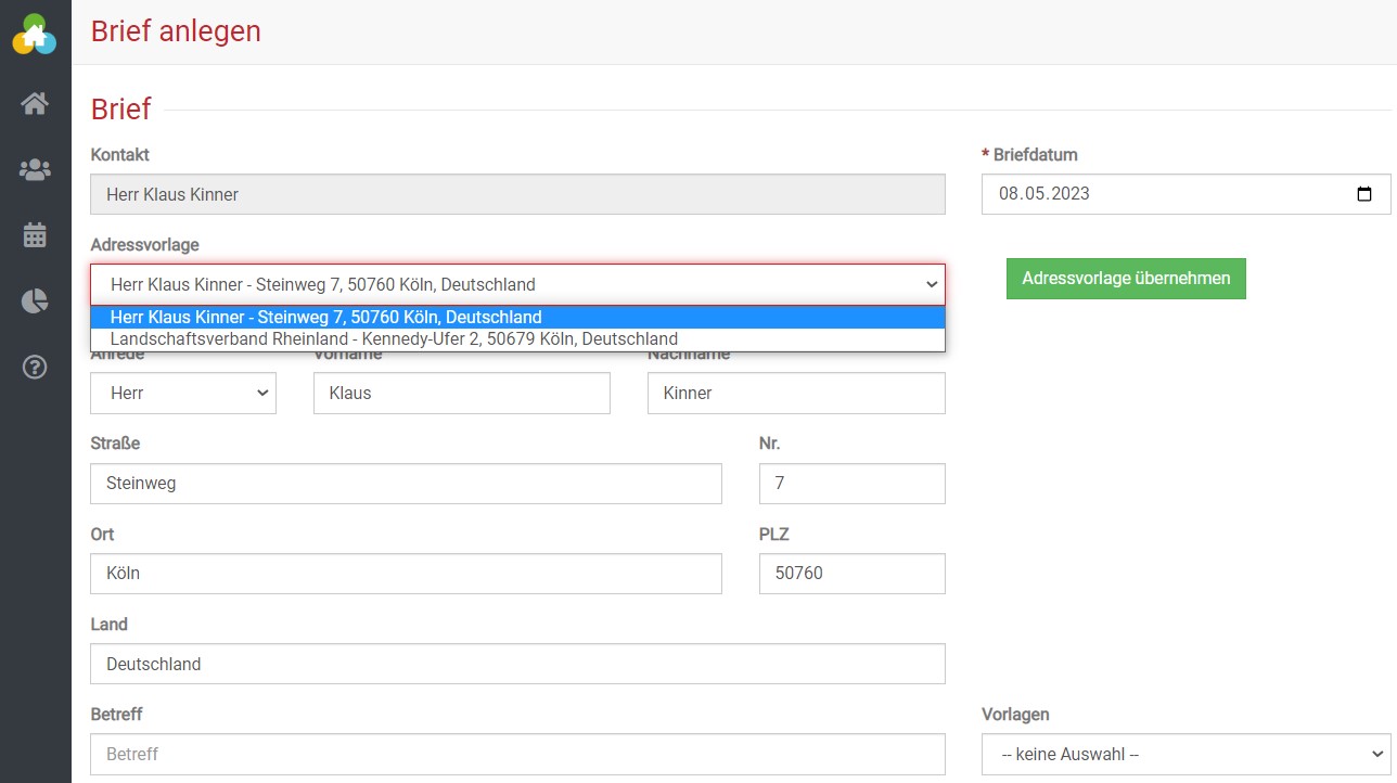 Sie können nun eine Adressvorlage wählen, sodass sich direkt die Stammdaten für die:den Empfänger:in gezogen werden.
