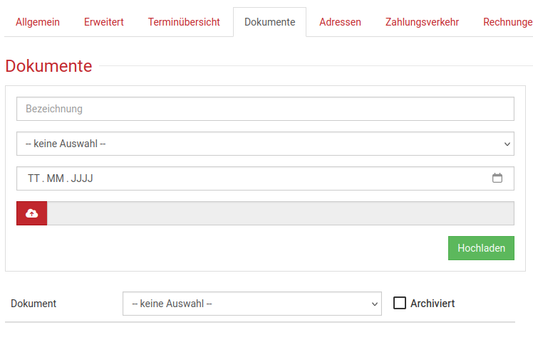 Im Reiter Dokumente in der Klient:in Akte können Sie Dokumente hochladen.