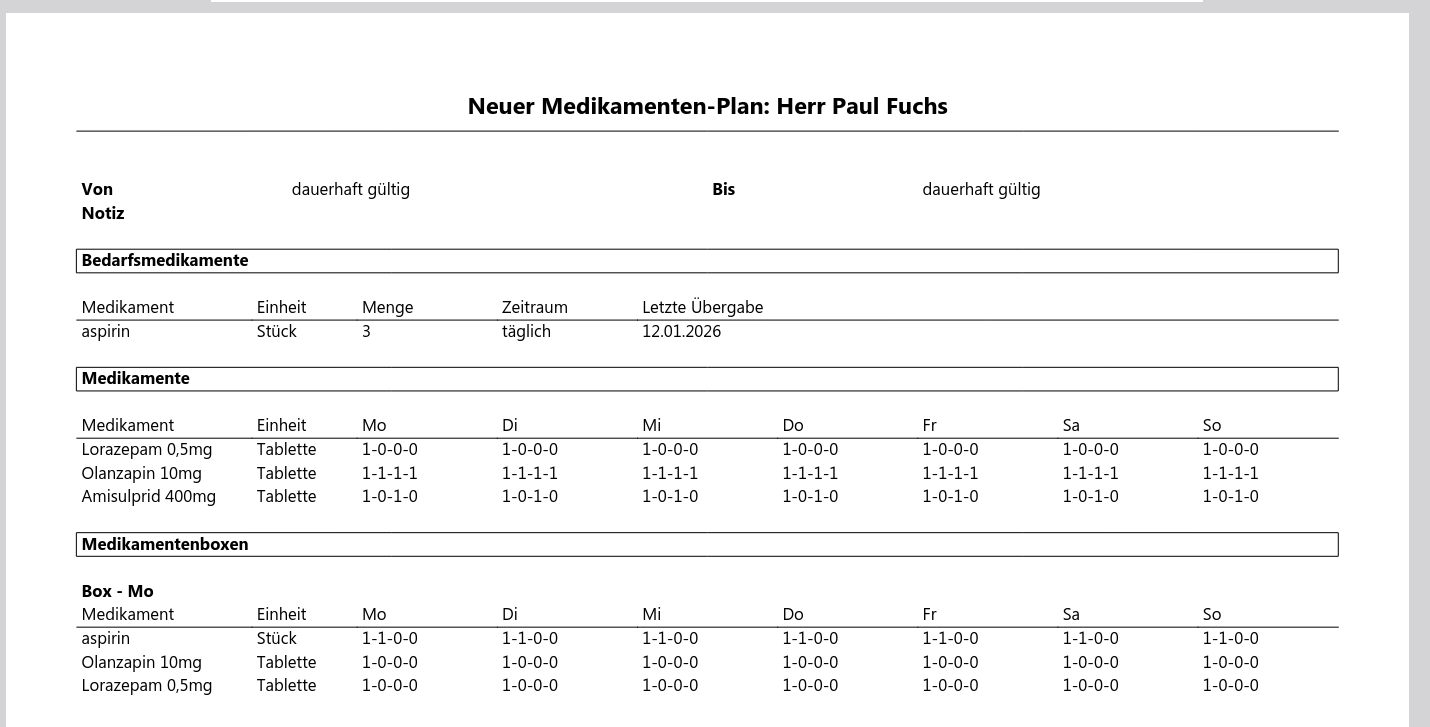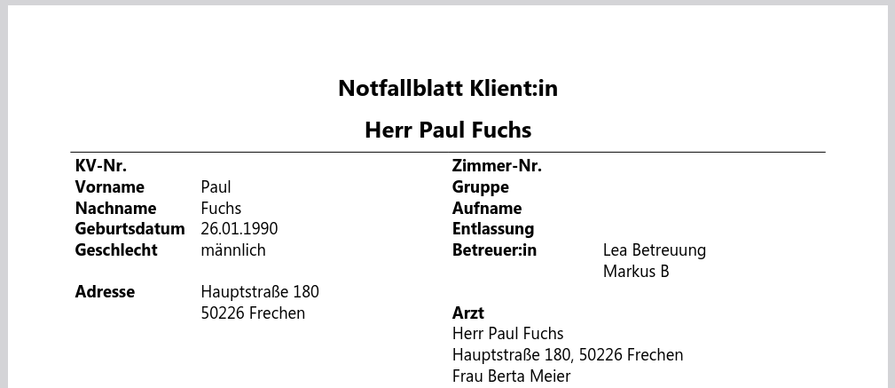 Nun erscheint ein PDF Dokument mit den wichtigsten Informationen zum Klienten bzw. zur Klientin, welche schnell an Ärzte o.ä. versendet werden kann. Ist die Medikation aktiv, erhalten Sie im Druck auch eine Übersicht des Medikationsplans.