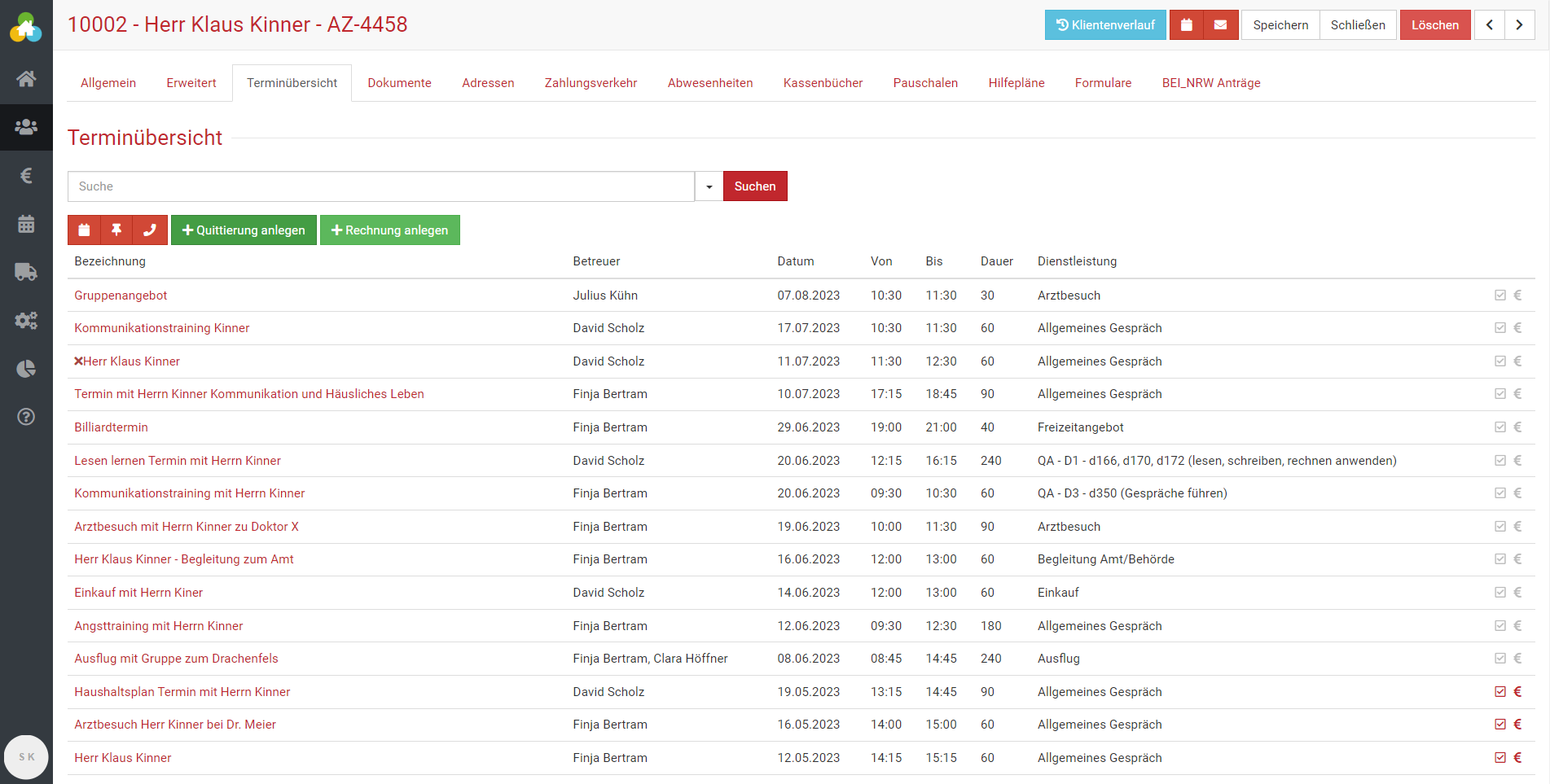 Bei Selbstzahler:innen oder Kostenträgern die z.B. eine monatliche Rechnung über die erbrachten Leistungen benötigen, zeigt das €-Symbol in der rechten Spalte an, ob die Rechnung bereits ausgestellt wurde oder nicht. Sobald die Rechnung ausgestellt wurde, wechselt das €-Symbol des entsprechenden Termins in der Terminübersicht von grau auf rot.