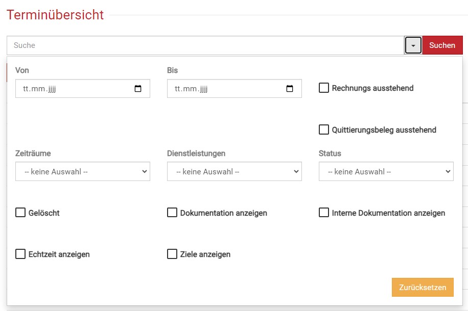 Filter in der Terminübersicht von BEWO-Online