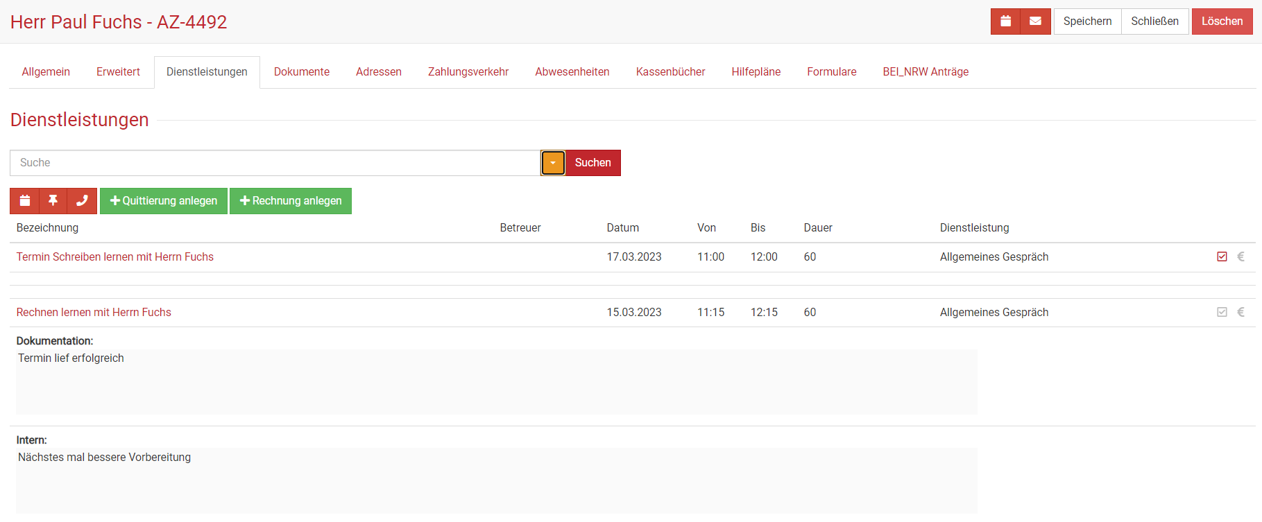 Im Reiter Dienstleistungen in der digitalen Klient:innenakte (via Betreuung -> Klienten ) können Sie sich interne und externe Dokumentationen der vergangenen Termine chronologisch anschauen.