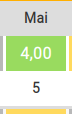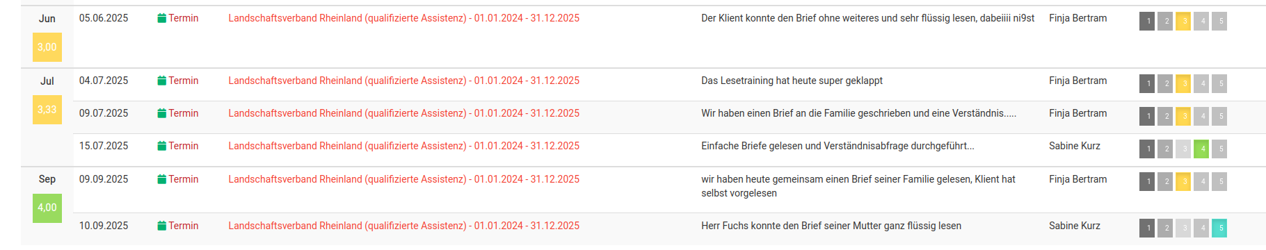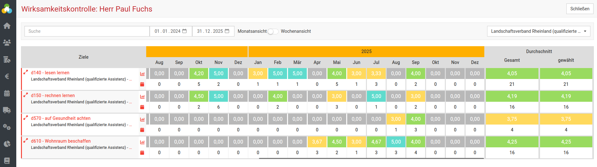 In der Tabelle sehen Sie oben farbig des jeweiligen Monats die durchschnittliche Bewertung, direkt darunter sehen Sie die Anzahl der Termine/Leistungen die mit diesem Ziel erbracht wurden.