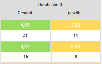 Im rechten Bereich in der Spalte „Durchschnitt“ wird ihnen zum einem immer der Gesamtdurchschnitt und daneben der Durchschnitt des gewählten Zeitraums angezeigt.