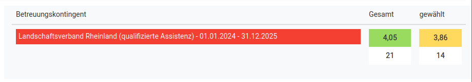 Im rechten Bereich sehen Sie die Betreuungskontingente mit gesamt und gewähltem Durchschnitt. Gibt es mehrere Betreuungskontingente mit gleichen Zielen werden hier alle Betreuungskontingente angezeigt und können an- oder abgewählt werden.