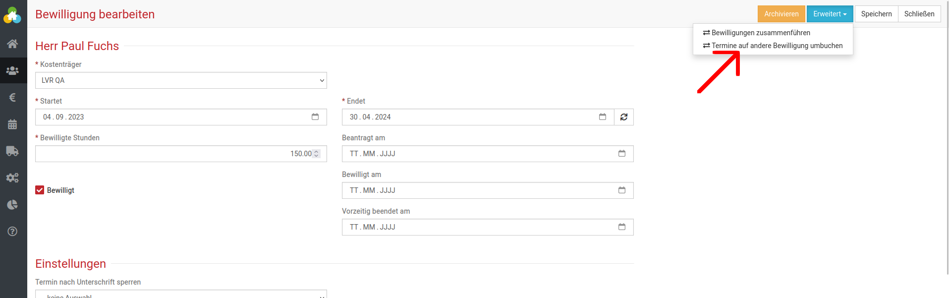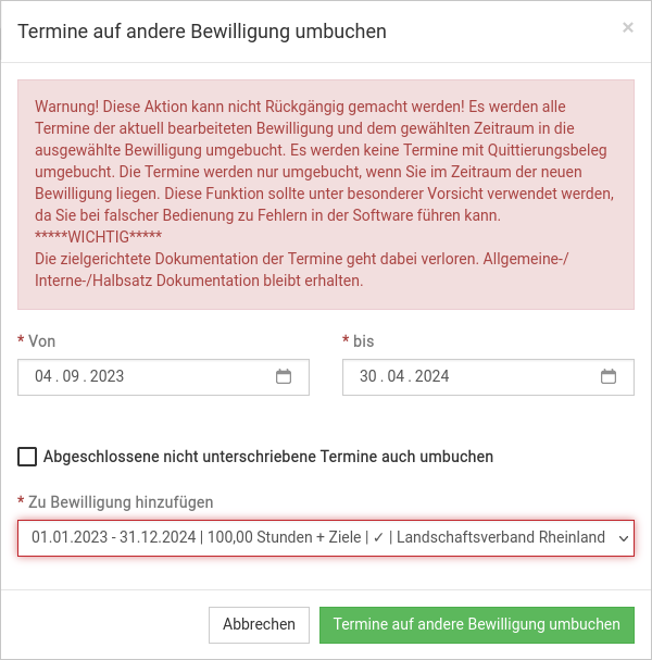 - Die Bewilligungszeiträume müssen sich zeitlich überschneiden. Falls dies nicht der Fall ist, können Sie die Zeiträume vorübergehend entsprechend anpassen, die gewünschten Termine umbuchen und im Anschluss die ursprünglichen Zeiträume wiederherstellen.
