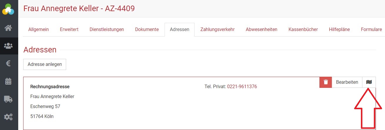 Wenn Sie über die Klient:innen-Akte den Reiter Adressen öffnen, sehen Sie die Übersicht aller Adressen, die zu diesem:r Klient:in gehören. Hier haben Sie die Möglichkeit, auf das Karten-Symbol oben rechts neben der Adresse zu klicken.