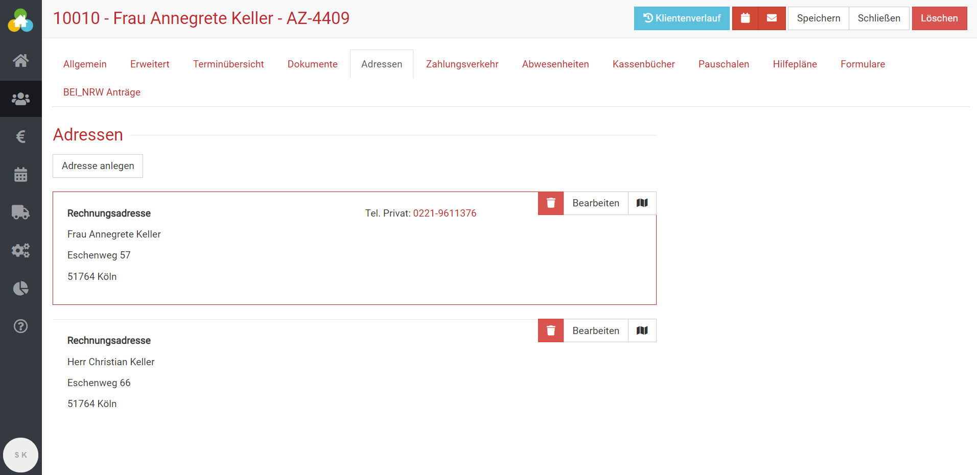 Es können im Reiter „Adressen“ der Akte noch weitere Adressen angelegt werden, welche individuell für diesen Klienten bzw. diese Klientin hinterlegten werden sollen. Dies können z.B. Lebenspartner:innen, Arbeitsorte oder individuelle Kostenträger sein.