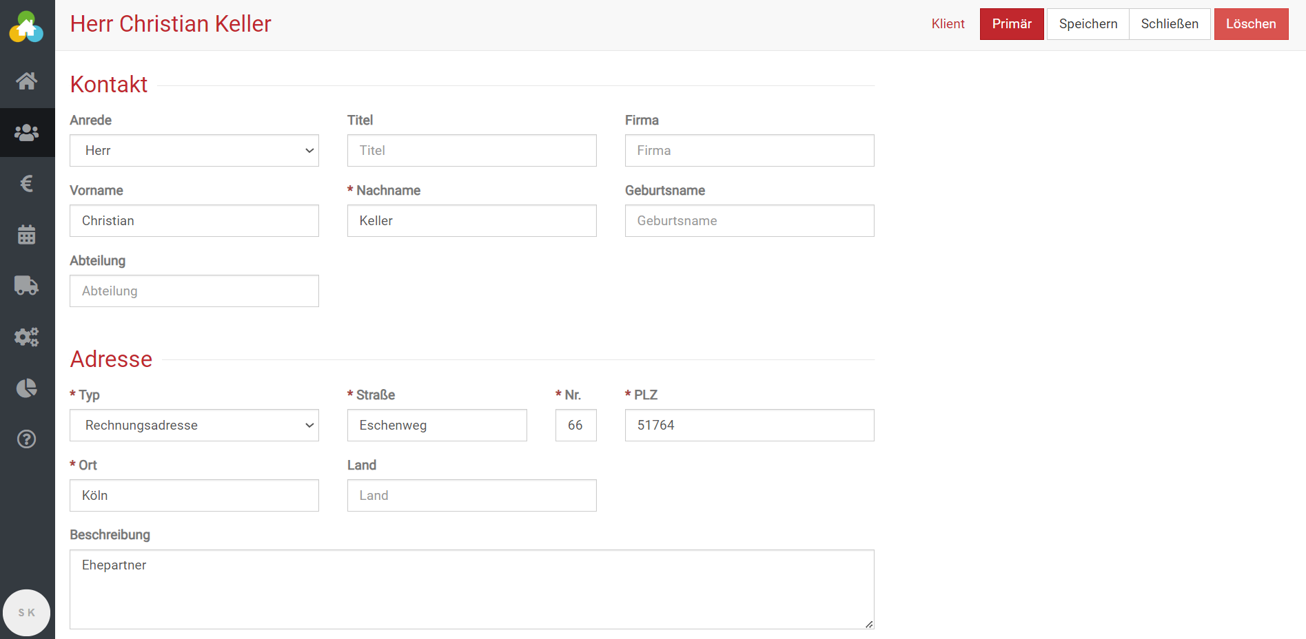 Die Primäradresse sollte jedoch nicht zu Adressen von anderen Personen mit anderen Adressen geändert werden, da sonst der Klient:innenname in der Akte geändert wird. Außerdem wird der Klient bzw. die Klientin dann nicht mehr in der Gesamtübersicht der Klient:innen via Betreuung -> Klienten angezeigt, sondern lediglich noch über die Gesamtübersicht der Adressen via Betreuung -> Adressen.