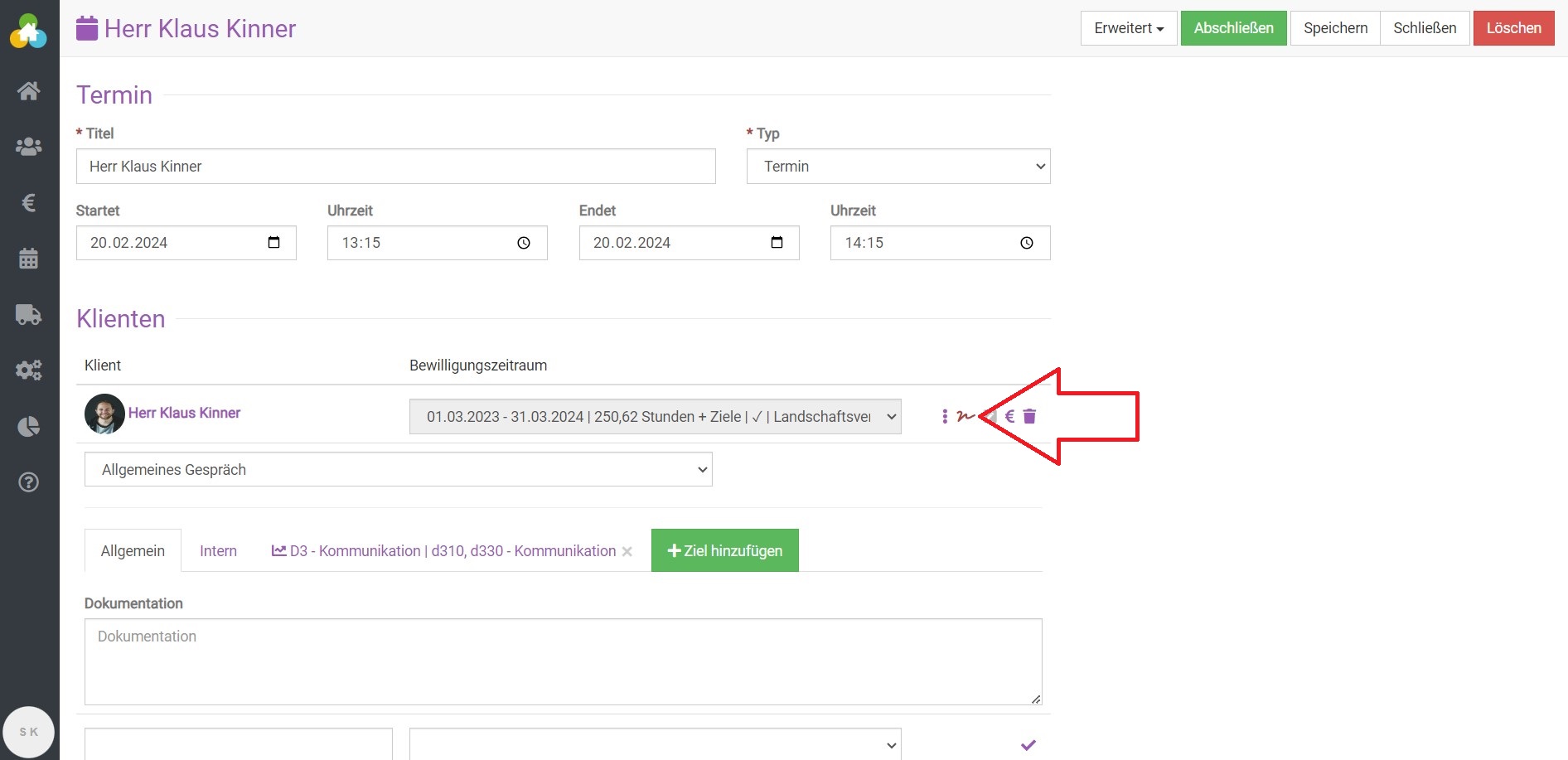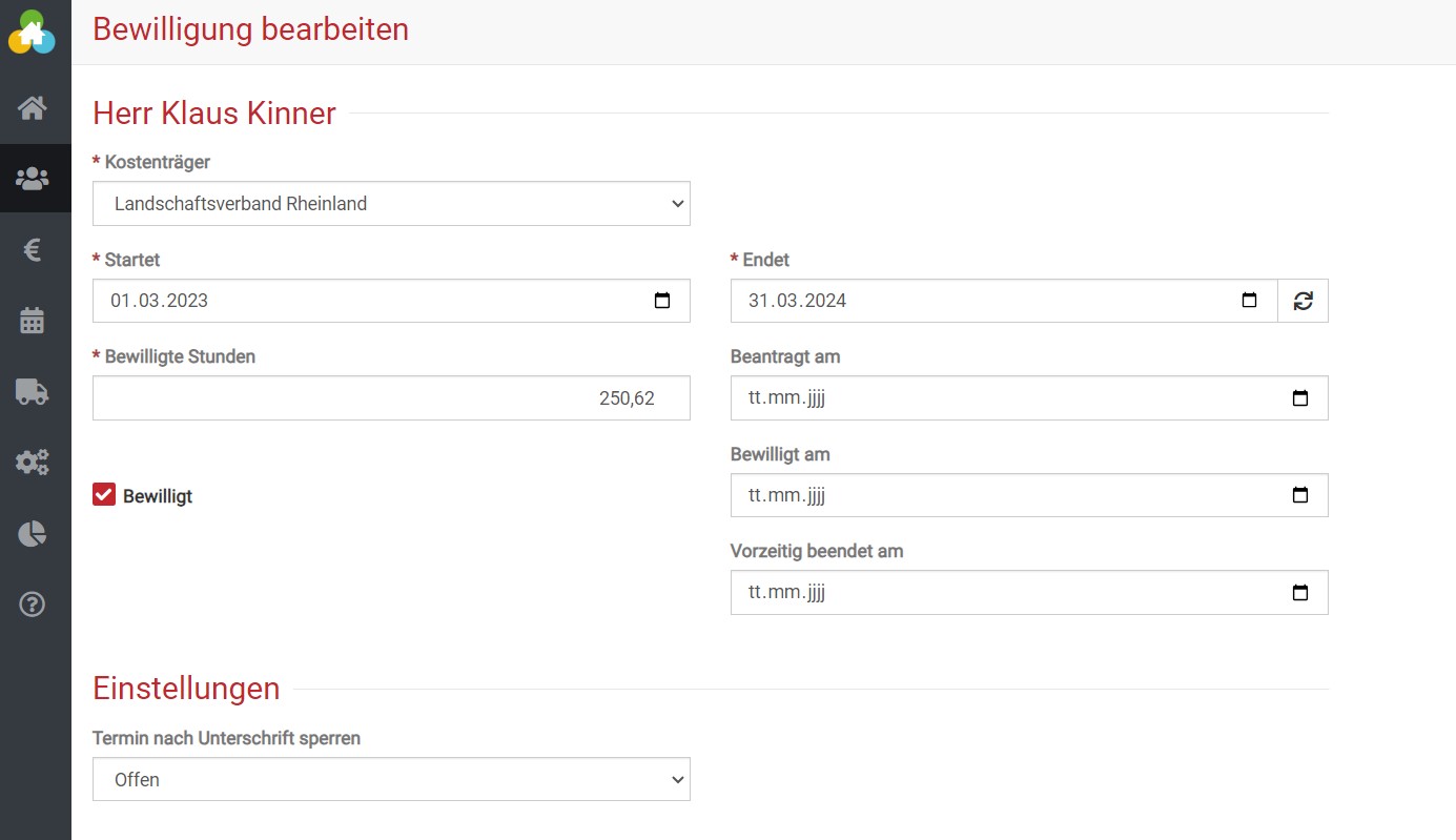 Dafür gehen Sie auf das Stiftsymbol zum Bearbeiten bei einem Bewilligungszeitraum in der Klient:innenakte und wählen dort für individuelle Klient:innen bzw. dem Bewilligungszeitraum eine alternative Möglichkeit aus.