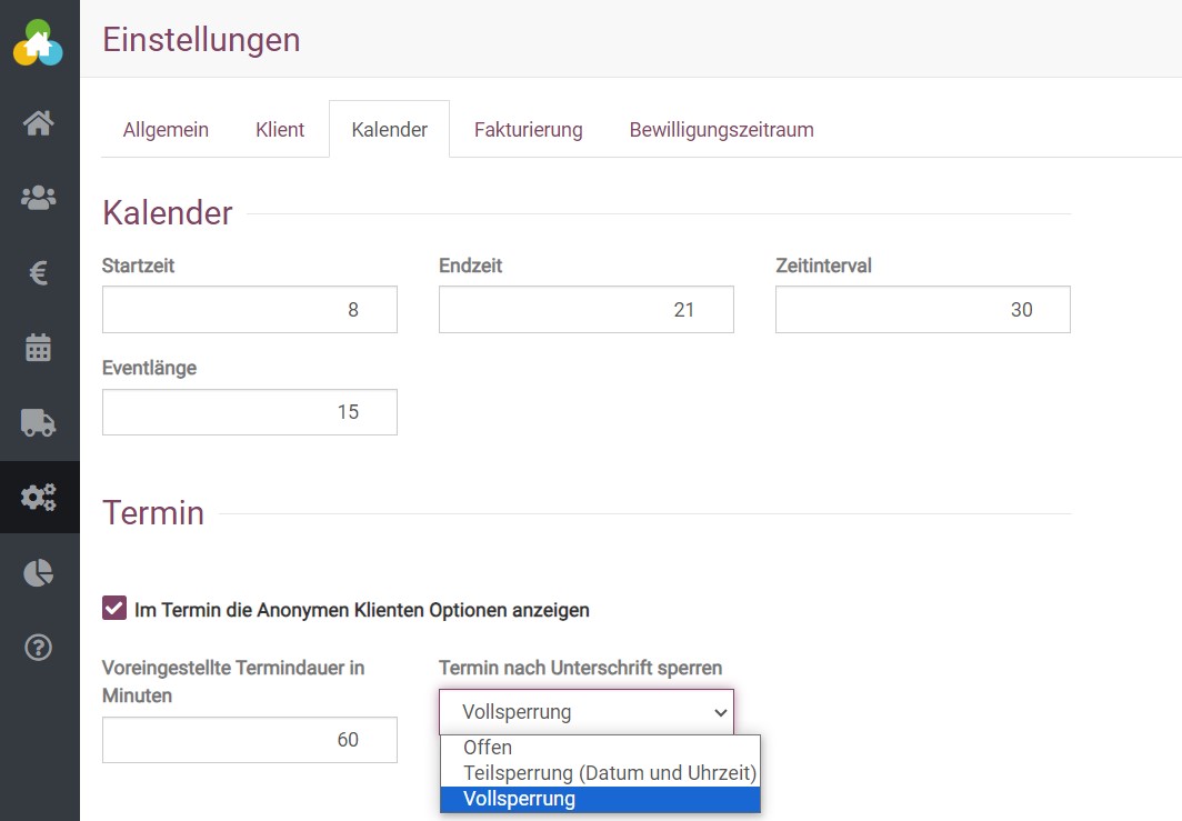Dort kann eine der 3 oben genannten Optionen bei „Termin nach Unterschrift sperren“ ausgewählt und dann oben rechts gespeichert werden.