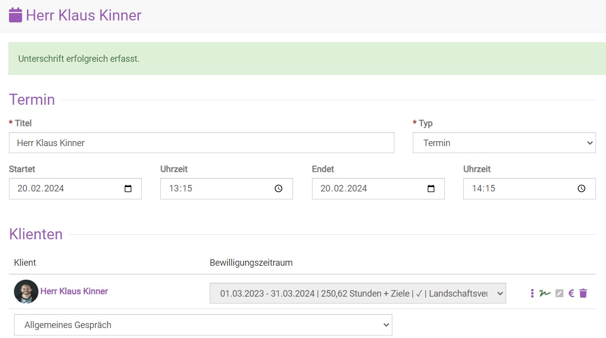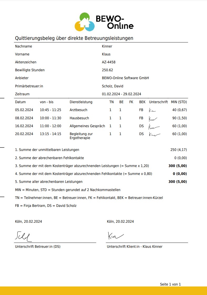 Nun unterschreiben Sie als Primärbetreuer:in oder alle Betreuer:innen, welche im Zeitraum Termine geleistet haben sowie der Klient bzw. die Klientin.