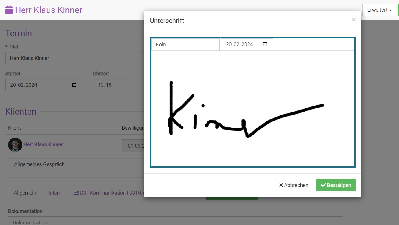 Es öffnet sich ein Fenster für die Quittierung, welches der Klient bzw. die Klient:in unterschreiben kann.
