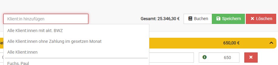 Sie können auch eine Zahlung nur für eine:n Klient:in hinterlegen. Dafür klicken Sie bei der Auswahl einfach die entsprechende Person an.