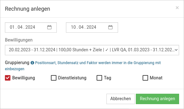 In der Klientenakte unter Terminübersicht können via „+Rechnung anlegen“ vor der Rechnungserstellung Einstellungen zur Gruppierung vorgenommen werden. Es können mehrere Bewilligungszeiträume gewählt werden und anschließend ein oder mehrere Gruppierungsoptionen ausgewählt werden.