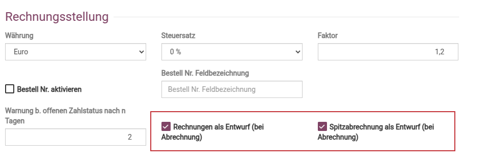 Rechnungen werden beim Anlegen erst als Entwurf angelegt. Eine Rechnung im Entwurf zieht keine Rechnungsnummer. Wenn Sie das Anlegen einer Rechnung als Entwurf global deaktivieren möchten, finden Sie die Einstellung unter