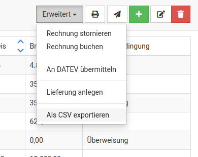 Unter Fakturierung->Rechnungen können selektierte Rechnungen via Erweitert->“Als CSV exportieren“, als CSV-Datei exportiert werden.