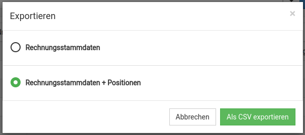 Beim CSV-Export gibt es die Option, Rechnungen mit oder ohne Positionen zu exportieren. Die Datei laden Sie anschließend via grünen Button „Als CSV exportieren“ runter.