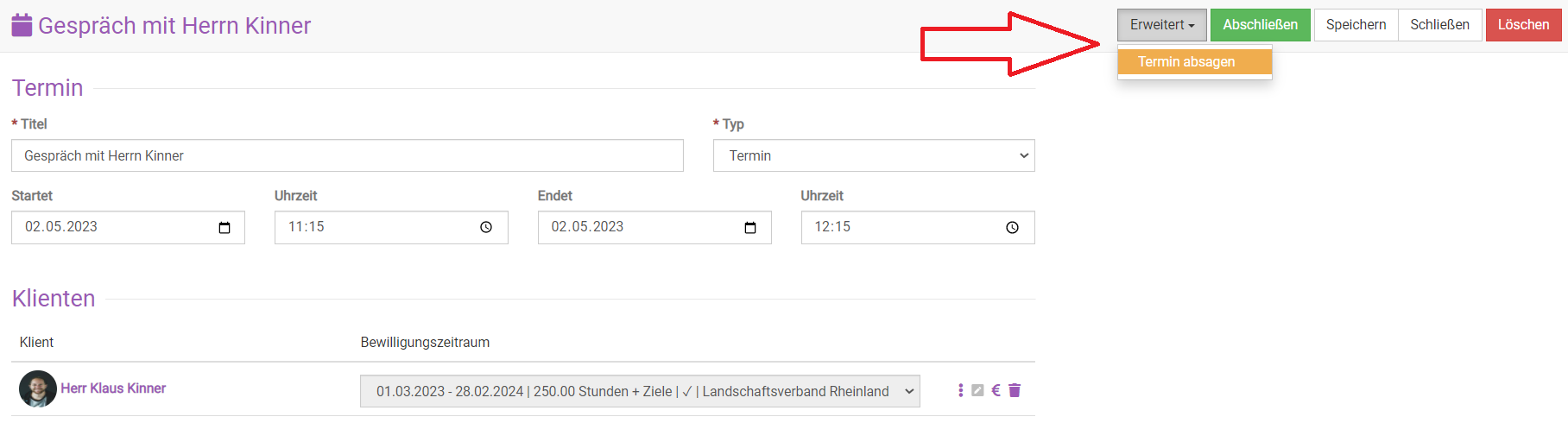 Oben rechts klicken Sie bei „Erweitert“ auf Termin absagen.