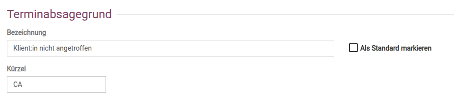 Im Folgefenster können Sie anschließend die Bezeichnung sowie das Kürzel angeben/anpassen und festlegen, ob der Terminabsagegrund der Standard hinterlegte Absagegrund ist. Ist der Grund als Standard festgelegt, wird dieser beim absagen eines Termins immer vorausgewählt.