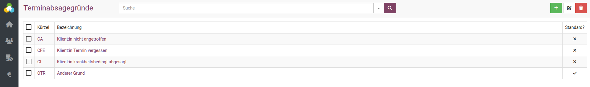 Um einen Terminabsagegrund anzupassen, klicken Sie auf das Kürzel oder die Bezeichnung. Möchten Sie einen neuen Terminabsagegrund hinterlegen, klicken Sie oben rechts auf das grüne Plus.
