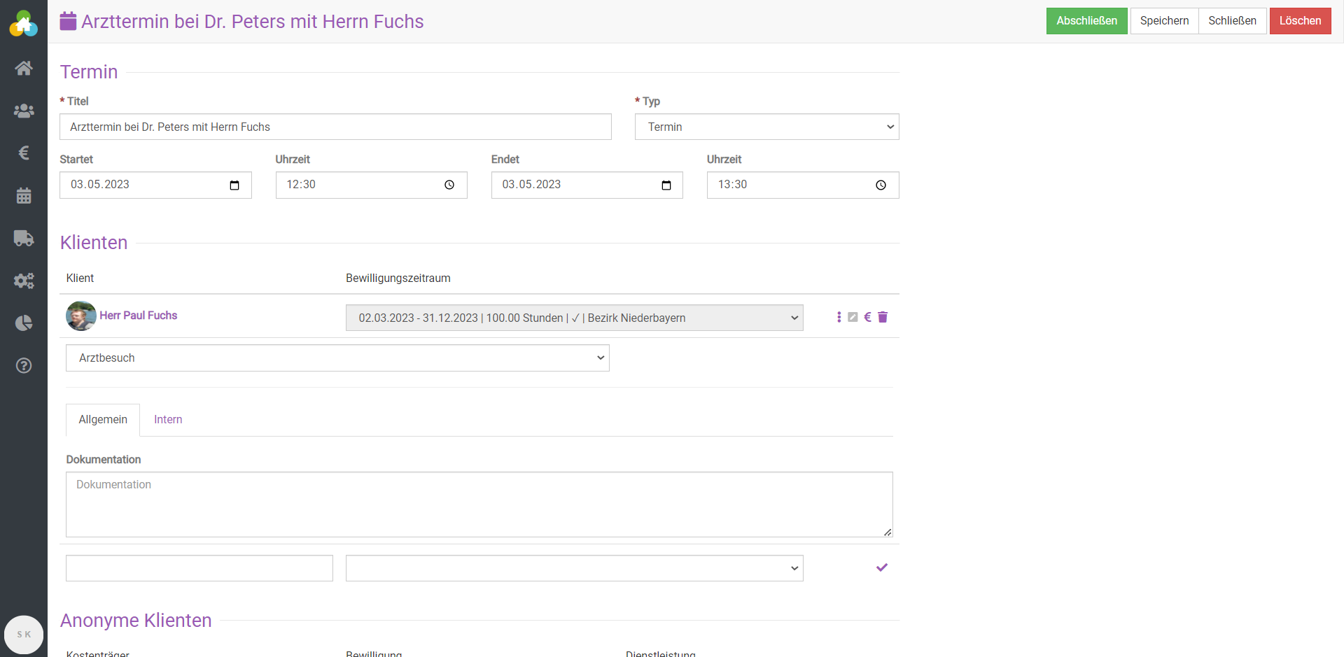Suchen Sie via Betreuung -> Klienten den Namen des:der Klient:in über die Suchmaske oder wählen Sie den Namen in ihrer Klient:innen-Übersicht aus. Durch Auswählen des:der Klient:in gelangen Sie zu den Stammdaten des:der Klient:in. Mit einem Klick auf den roten Kalender-Button oben rechts, gelangen Sie direkt zu dem Terminfenster. Nun können Sie den Termin noch um Datum, Uhrzeit, Dienstleistung usw. ergänzen.