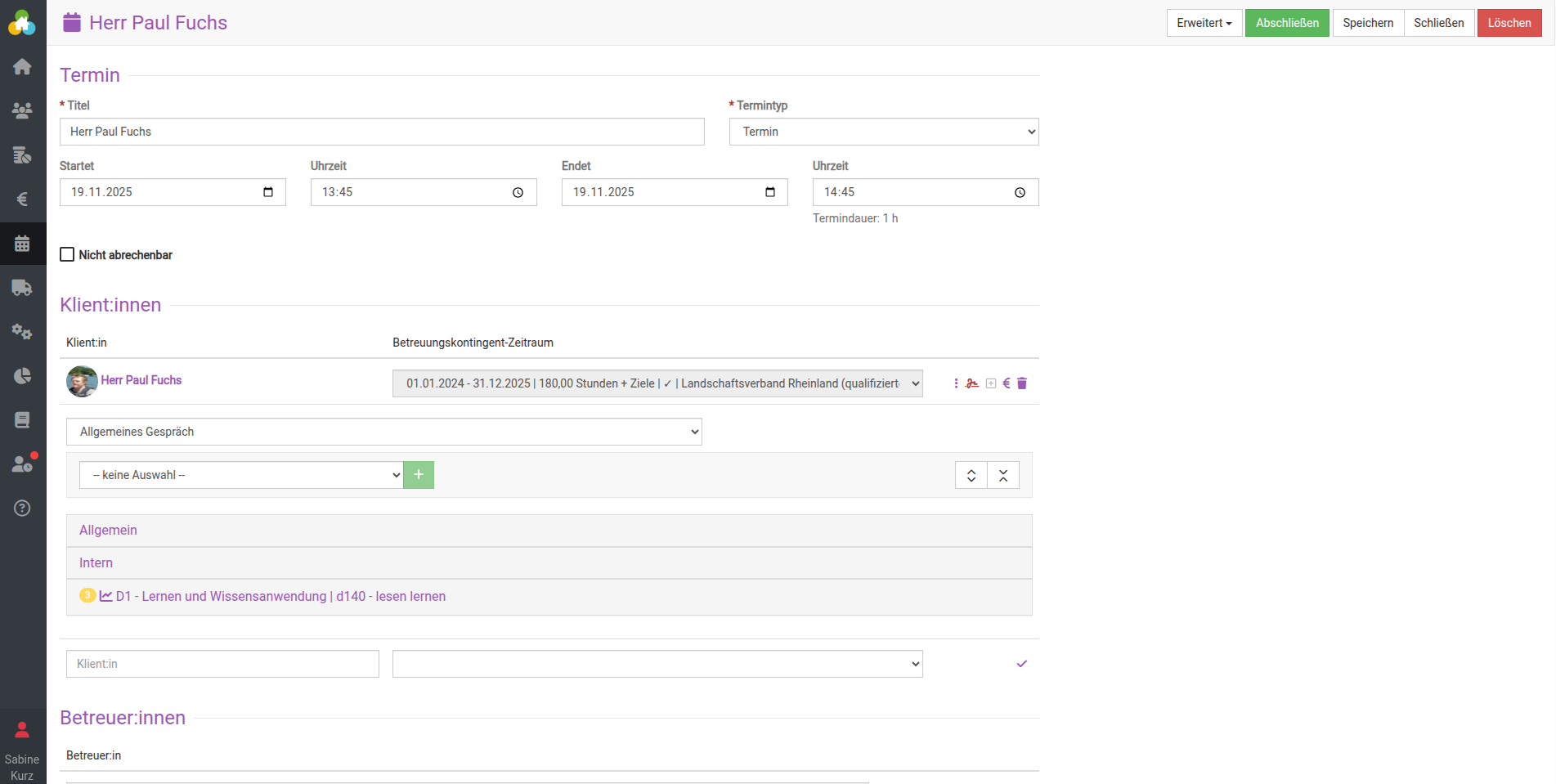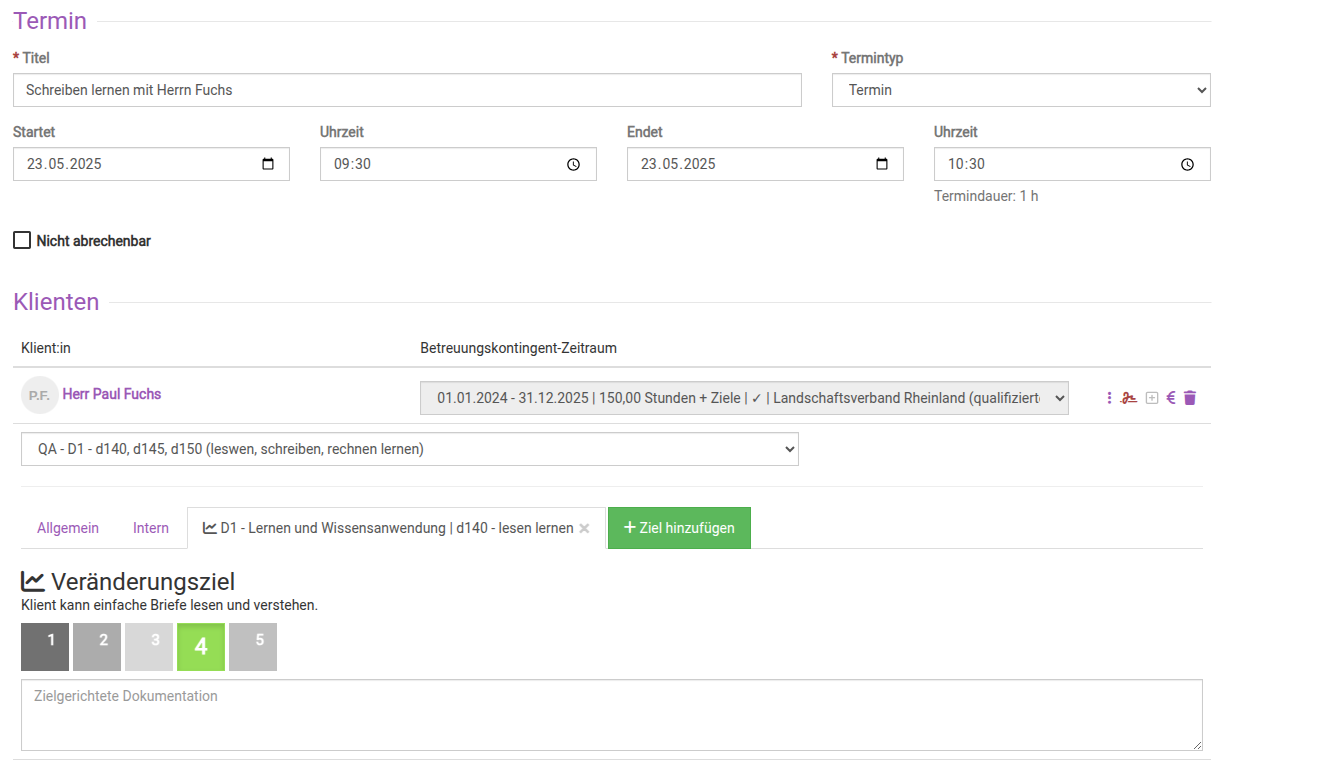 Befüllen Sie den Titel, die Uhrzeit bzw. Echtzeit wie gewohnt und wählen Sie den:die Klient:in und den Bewilligungszeitraum mit Zielen aus.