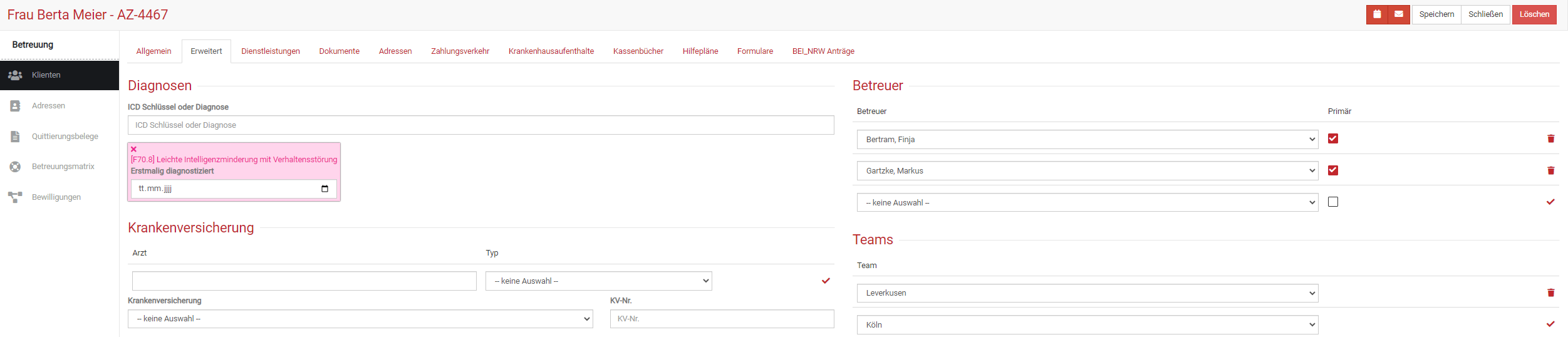 In der Klient:innen-Akte unter Erweitert können Sie die:den Klient:in einem oder mehreren Teams zuordnen.