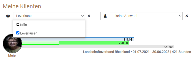 Auf dem Dashboard haben Sie die Möglichkeit, die verschiedenen Teams auszuwählen und sich nur die Klient:innen eines ausgewählten Teams anzeigen zu lassen.
