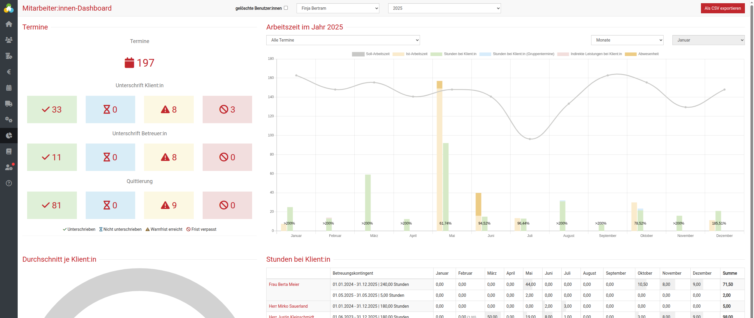 Neben den monatlichen Arbeitszeiten finden sich hier die durchschnittliche Betreuungszeit pro Klient:in und ein allgemeiner Durchschnittswert. Die Zahlen sind in Form von Diagrammen dargestellt und geben einen groben Überblick über die bisher geleisteten Arbeitszeiten eines laufenden Jahres.