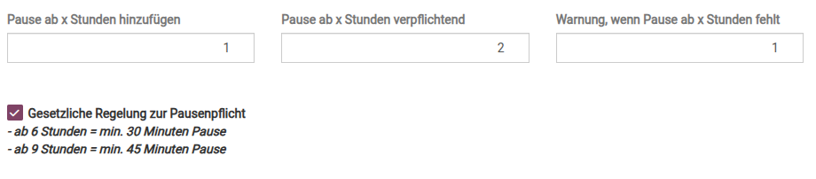 Gesetzliche Regelung zur Pausenpflicht -> ist die Checkbox aktiv, muss eine Pause von mindestens 30 Minuten bei einer Arbeitszeit von 6 Stunden, sowie eine Pause von mindestens 45 Minuten bei einer Arbeitszeit von 9 Stunden angegeben werden.