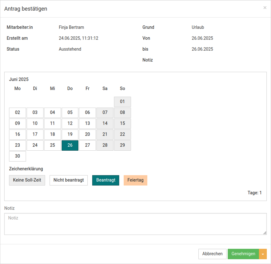 Wird der Antrag genehmigt, wird jeweils ein Eintrag in der Arbeitsplanung und in der Zeiterfassung angelegt.