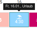 Wurde an einem Abwesenheitstag/Urlaubstag oder Feiertag Arbeitszeit erfasst, wird dies mit dem jeweiligen Symbol sowie der Arbeitszeit dargestellt.