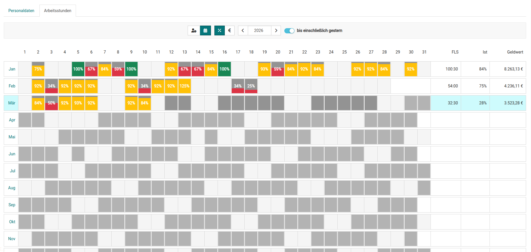 Im Reiter „Arbeitsstunden“ finden Sie die Jahresansicht für die Soll- und Ist-Stunden (Zeiterfassung), sowie das Zeitkonto der jeweiligen Mitarbeiter:innen. Klicken auf das Kalender-Symbol, gelangen Sie in die Ansicht der erbrachten Fachleistungsstunden.