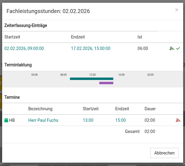 Mit einem Klick auf den entsprechenden Eintrag gelangen Sie direkt in den Zeiterfassungs-Eintrag oder den Termin-Eintrag.
